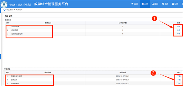 3.点击【申请】后,在下方“申请记录”一栏中会弹出已申请的“成绩档案表/在读证明/应届毕业生证明”,点击“操作”一栏中的【下载】选项,即可生成带有防伪二维码、加盖成绩证明专用章的PDF版“成绩档案表/在读证明/应届毕业生证明”